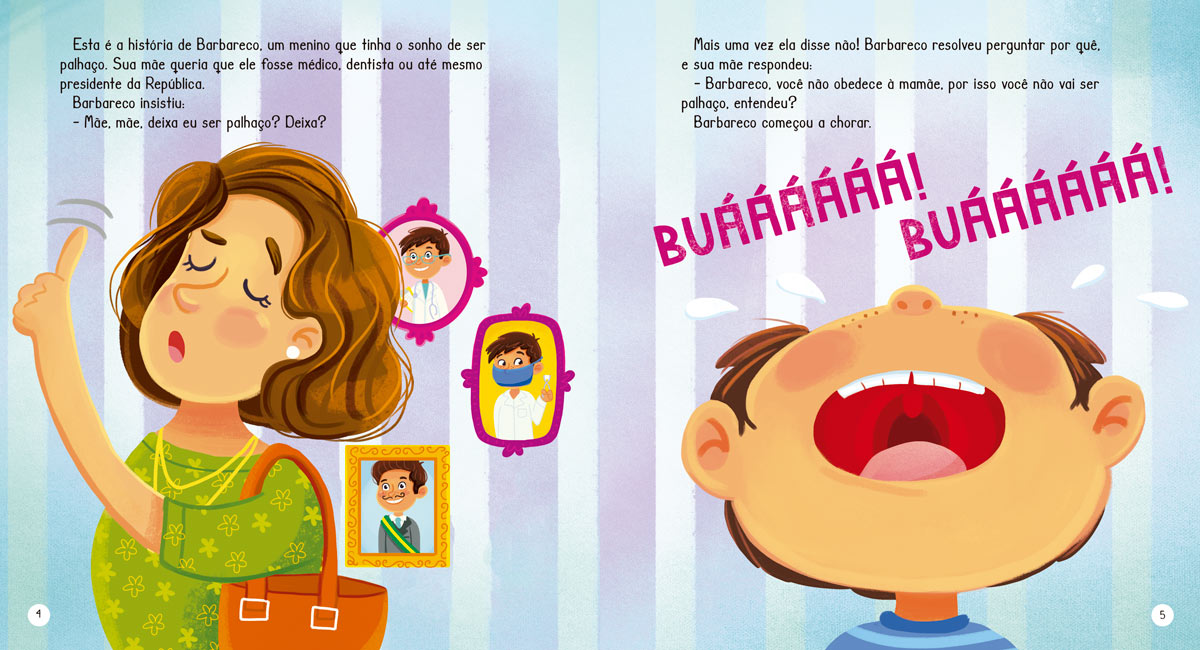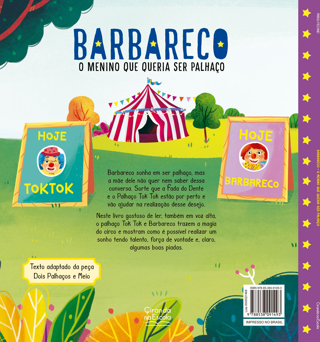 Barbareco sonha em ser palhaço, mas a mãe dele não quer nem saber dessa conversa. Sorte que a Fada do Dente e o Palhaço Tok Tok estão por perto e vão ajudar na realização desse desejo.Neste livro gostoso de ler, também em voz alta, o palhaço Tok Tok e Barbareco trazem a magia do circo e mostram como e possível realizar um sonho tendo talento, forca de vontade e, claro, algumas boas piadas.
