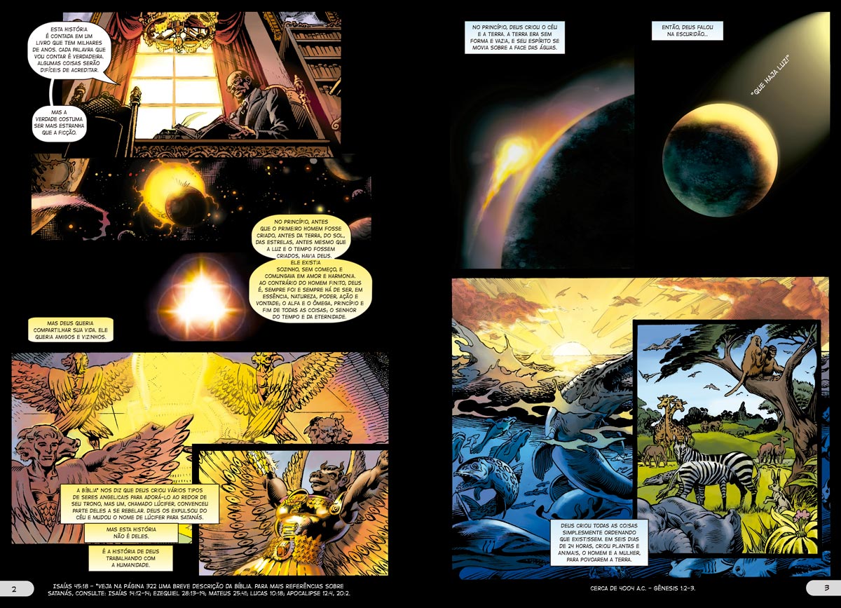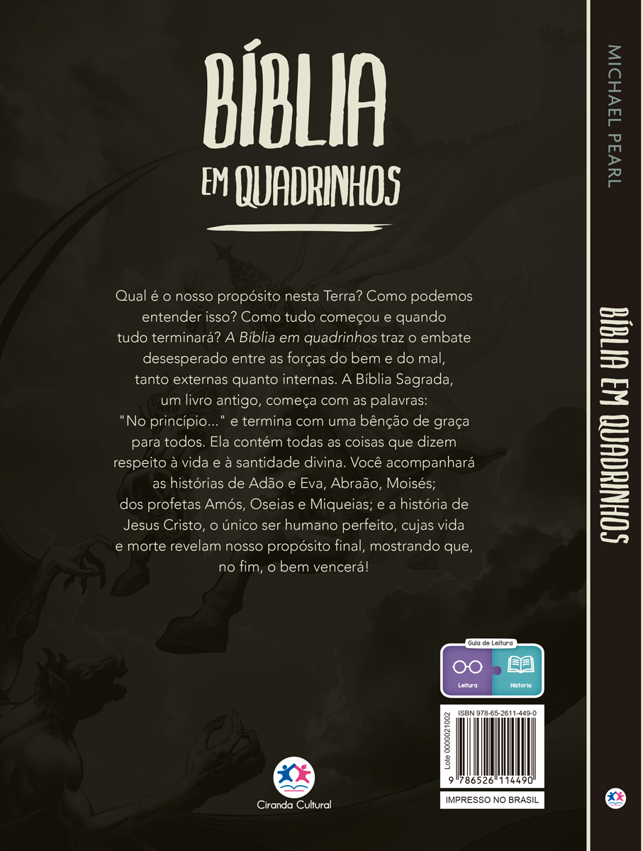 A história da luta desesperada entre as forças do Bem e do Mal, tanto internas quanto externas. Qual é o nosso propósito nesta Terra? Como podemos entender isso? Como tudo começou e quando tudo terminará? Um livro antigo começa com as palavras: No princípio… e termina com uma bênção de graça para todos. Esse livro é a Bíblia Sagrada, inspirada por nosso Criador. Ela contém tudo o que diz respeito à vida e à santidade divina. Entretanto, como foi escrito por pessoas de uma cultura bem diferente da nossa, muitos acham esse livro antigo difícil de entender. Este livro foi feito para esses. Um pastor de uma pequena congregação na África Central disse: Tenho ensinado a Bíblia há 40 anos, mas não tinha uma ideia geral até ler essa HQ. Você conhecerá pessoas como:Adão e Eva, cujos momentos de fraqueza abriram a porta para uma tragédia histórica, mas também para a promessa de que um dia essa tragédia terá fim.Abraão, que se tornou um dos primeiros modelos de fé e esperança.Moisés, que libertou seu povo da escravidão, revelando nossa necessidade da ajuda divina.Acabe e Jezabel, cujos reinados sanguinários como rei e rainha demonstram que até as pessoas poderosas sofrem consequências de seus atos.Amós, Oseias e Miqueias, que mostraram, com suas profecias impressionantes, que o bem vencerá.Jesus Cristo, o único ser humano perfeito, cuja vida e morte revelam nosso propósito final.