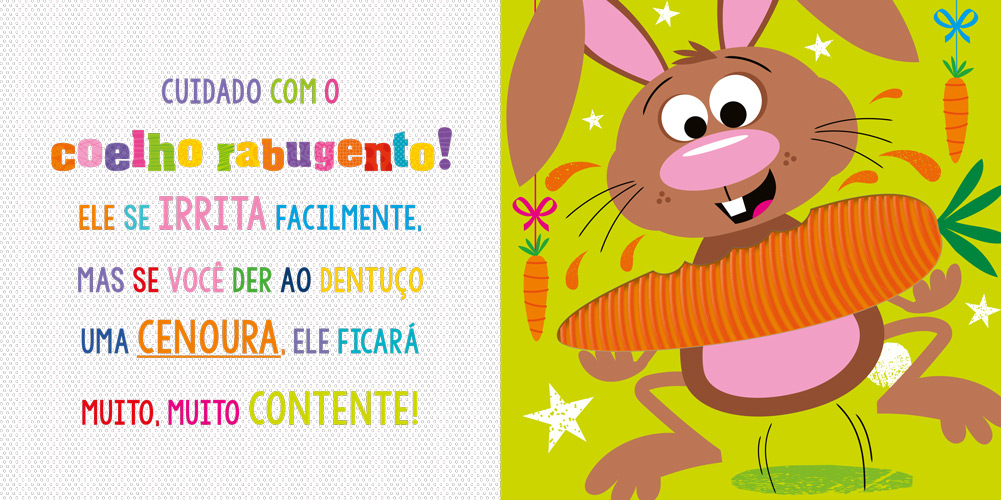 O coelho e seus amigos estão mal-humorados. Por isso, precisam da sua ajuda para alegrá-los. Leia este livro, toque nos animais e descubra o que fazer quando encontrar algum deles por aí.