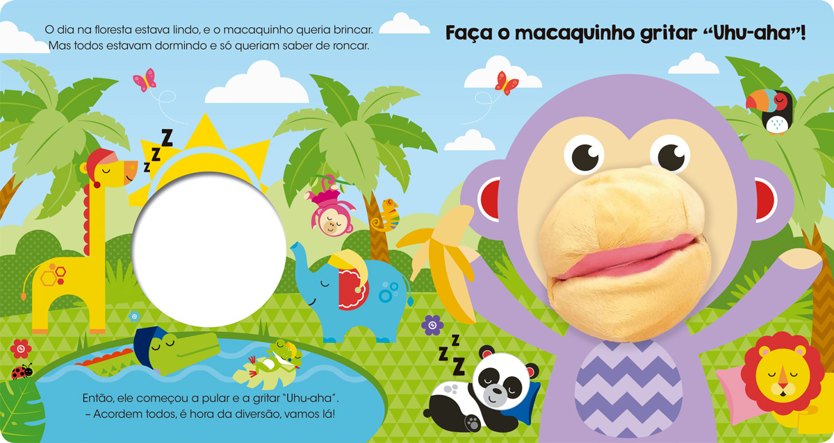 O macaquinho estava muito feliz e, por isso, chamou os amigos para brincar. Divirta-se com o fantoche deste livro enquanto se aventura com esta história rimada.