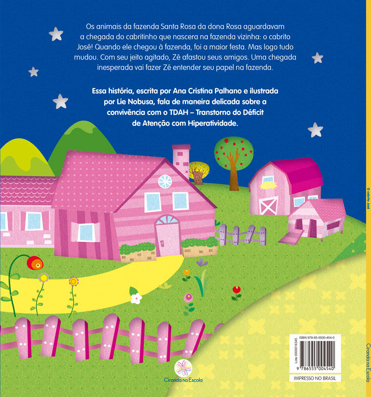 Os animais da fazenda Santa Rosa da dona Rosa aguardavam a chegada do cabritinho que nascera na fazenda vizinha: o cabrito José! Quando ele chegou à fazenda, foi a maior festa. Mas logo tudo mudou. Com seu jeito agitado, Zé afastou seus amigos. Uma chegada inesperada vai fazer Zé entender seu papel na fazenda. Essa história, escrita por Ana Cristina Palhano e ilustrada por Lie Nobusa, fala de maneira delicada sobre a convivência com o TDAH Transtorno do Déficit de Atenção com Hiperatividade.