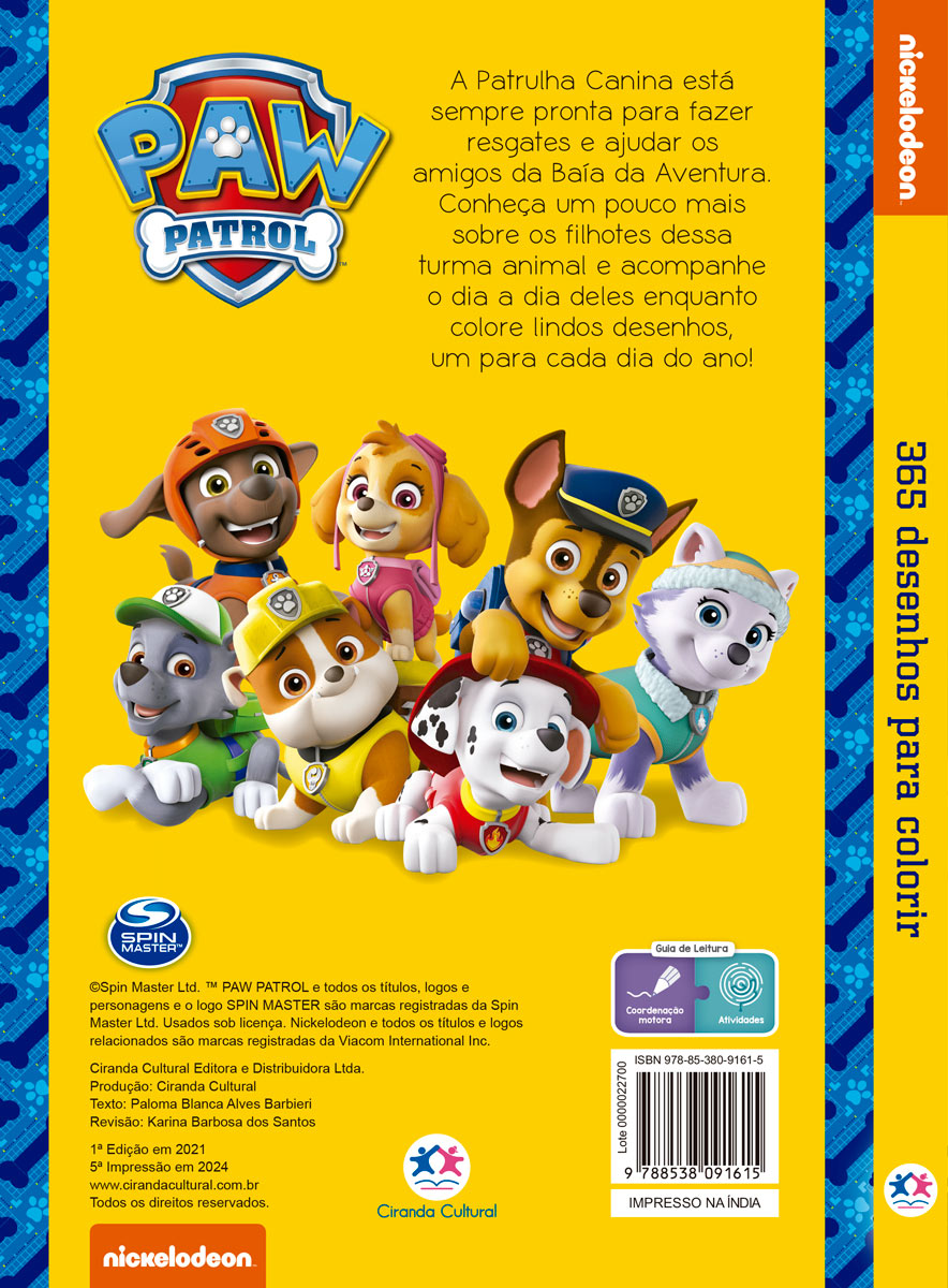 Ryder e a Patrulha Canina estão sempre prontos para fazer um resgate e ajudar seus amigos da Baía da Aventura. Conheça um pouco mais sobre essa turma animal e acompanhe o dia a dia deles enquanto pinta fantásticas ilustrações. Há uma imagem para cada dia do ano!