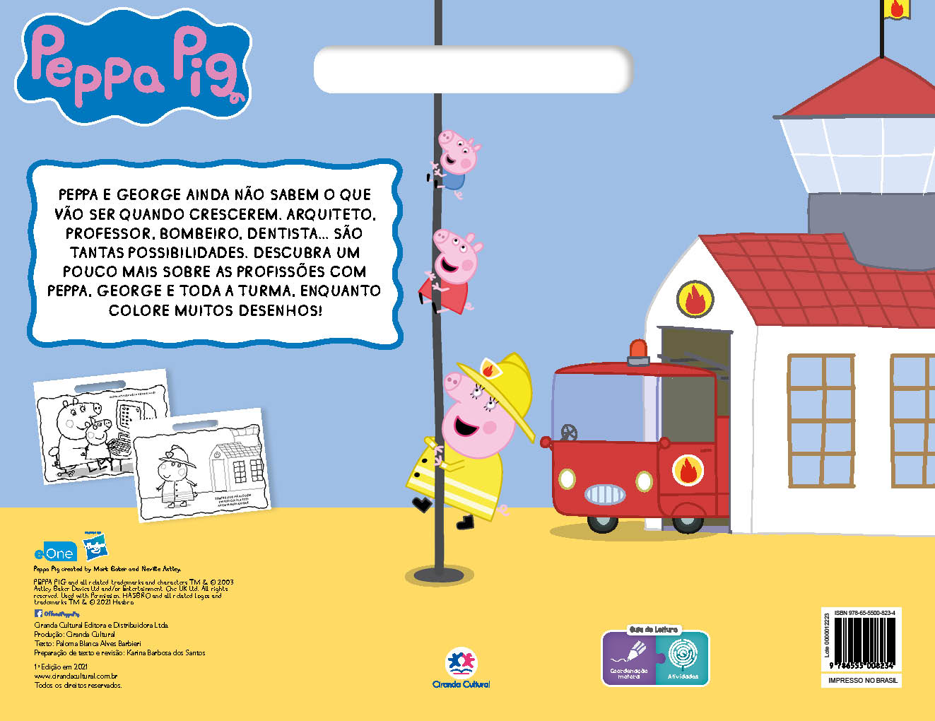 Peppa e George não sabem o que vão ser quando crescer. Arquiteto, professor, bombeiro, dentista… São tantas possibilidades. Descubra um pouco mais sobre as profissões com Peppa, George e toda a turma, enquanto pinta muitos desenhos!