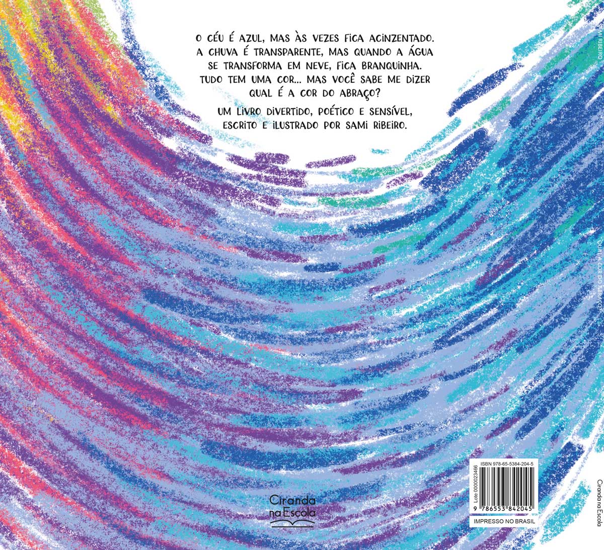 O céu é azul, mas às vezes fica acinzentado. A chuva é transparente, mas quando a água se transforma em neve, fica branquinha. Tudo tem uma cor… mas você sabe me dizer qual é a cor do abraço? Um livro divertido, poético e sensível, escrito e ilustrado por Sami Ribeiro.
