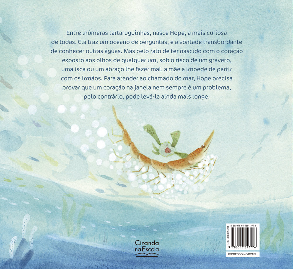 Entre inúmeras tartaruguinhas, nasce Hope, a mais curiosa de todas. Ela traz um oceano de perguntas, e a vontade transbordante de conhecer outras águas. Mas pelo fato de ter nascido com o coração exposto aos olhos de qualquer um, sob o risco de um graveto, uma isca ou um abraço lhe fazerem mal, a mãe a impede de partir com os irmãos. Para atender ao chamado do mar, Hope precisa provar que um coração na janela nem sempre é um problema, pelo contrário, pode levá-la ainda mais longe.